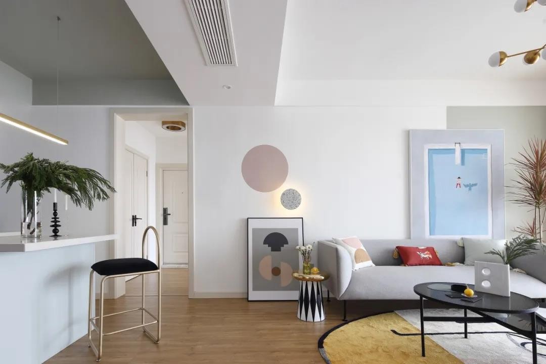 沙發(fā)墻潔凈的墻面加入白色與灰色的雙色設(shè)計(jì),掛放一幅極簡(jiǎn)的掛畫(huà),左側(cè)還有兩盞圓形的壁燈?;疑妓嚿嘲l(fā),還有鮮艷活