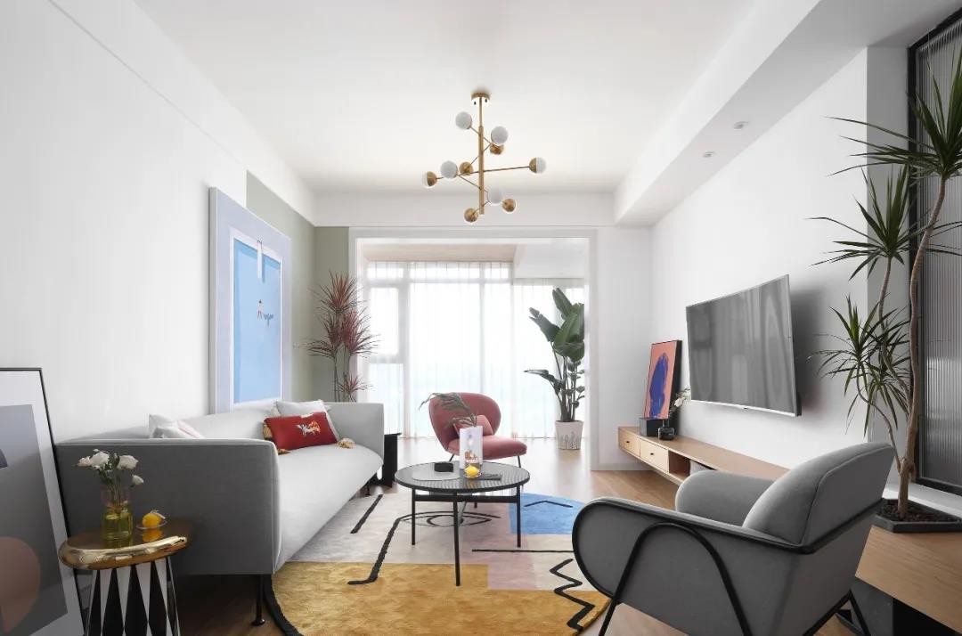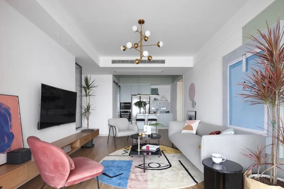 粉色休閑椅、在掛畫(huà)與地毯、綠植也是加入了粉色的元素,使得簡(jiǎn)約的空間更加浪漫雅致。頂上一盞金屬色的吊燈,則是增添了空間的華麗檔次感