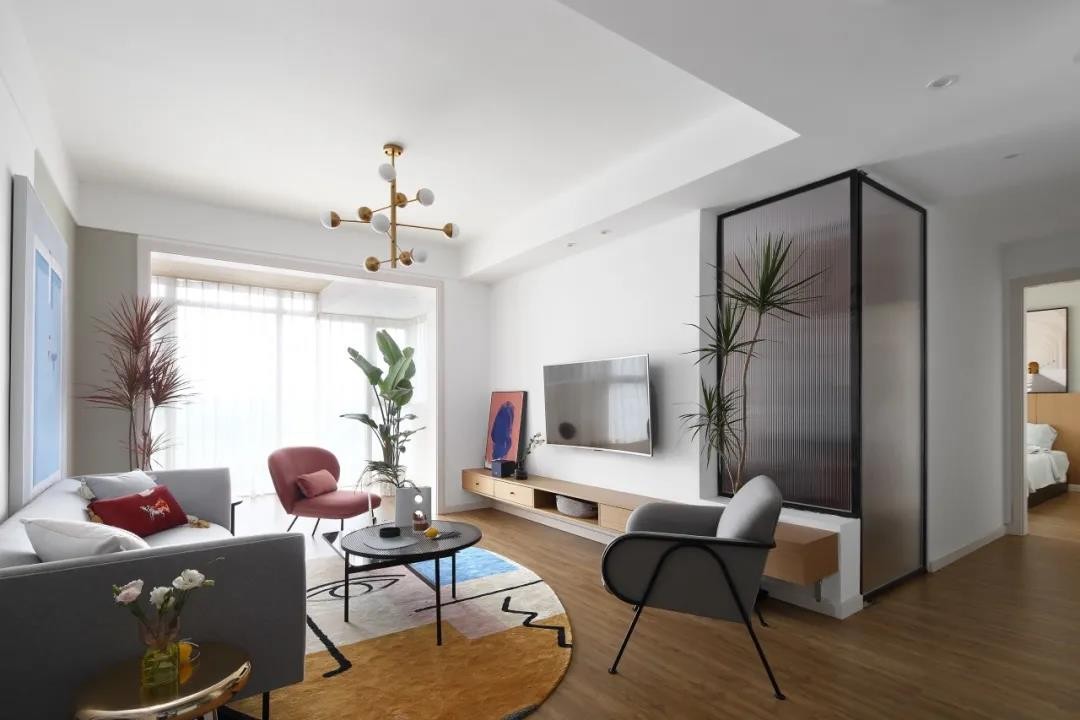 電視墻以懸空的木質(zhì)電視柜+壁掛電視機(jī),電視墻右邊加入長(zhǎng)虹玻璃的室內(nèi)隔斷,讓空間的光線得以共享,同時(shí)也增加了空間的設(shè)計(jì)感。