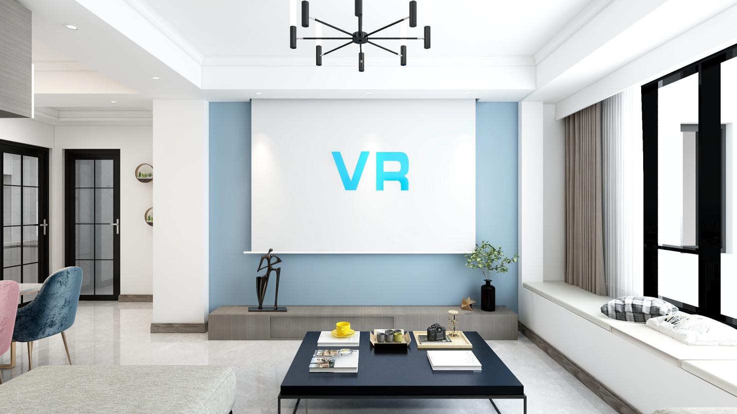 電視背景墻以少即是多的態(tài)度為室內(nèi)塑造更多的想象空間,大面積留白的思路結(jié)合跳脫的藍(lán)色色點(diǎn)綴呼應(yīng),回歸到電視墻本質(zhì)把視覺(jué)更多留在電視。