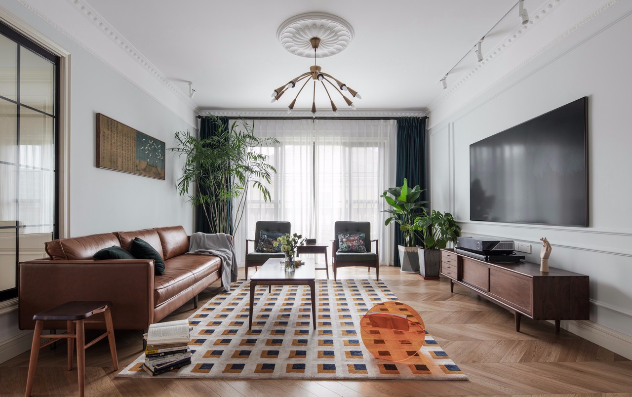 客廳大體是一家三口最長活動(dòng)場所,這個(gè)區(qū)域我總體采用的功能性和美觀性結(jié)合的方式。 整體色調(diào)的統(tǒng)一:整體以胡桃實(shí)木的顏色做總色調(diào),從胡桃實(shí)木的茶幾到胡桃木的電視柜,再到棕色調(diào)的真皮沙發(fā),最后再是一塊長方形的大地毯,做幾個(gè)顏色(淺白+棕色+黑色)的重疊,與整個(gè)空間所有顏色進(jìn)行呼應(yīng)。房主很喜歡夏威椰,因?yàn)橛兄竦臍赓|(zhì),因此它別名也叫夏威夷竹子。濃綠的色彩,茂密的枝條,富有光澤的綠葉傳遞給人一種欣欣向榮的精神氣。它能通過呼吸微調(diào)節(jié)空氣環(huán)境,吸收房中甲醛等揮發(fā)性物質(zhì)。從風(fēng)水上來講,它放在柱子下面有去煞氣之說。