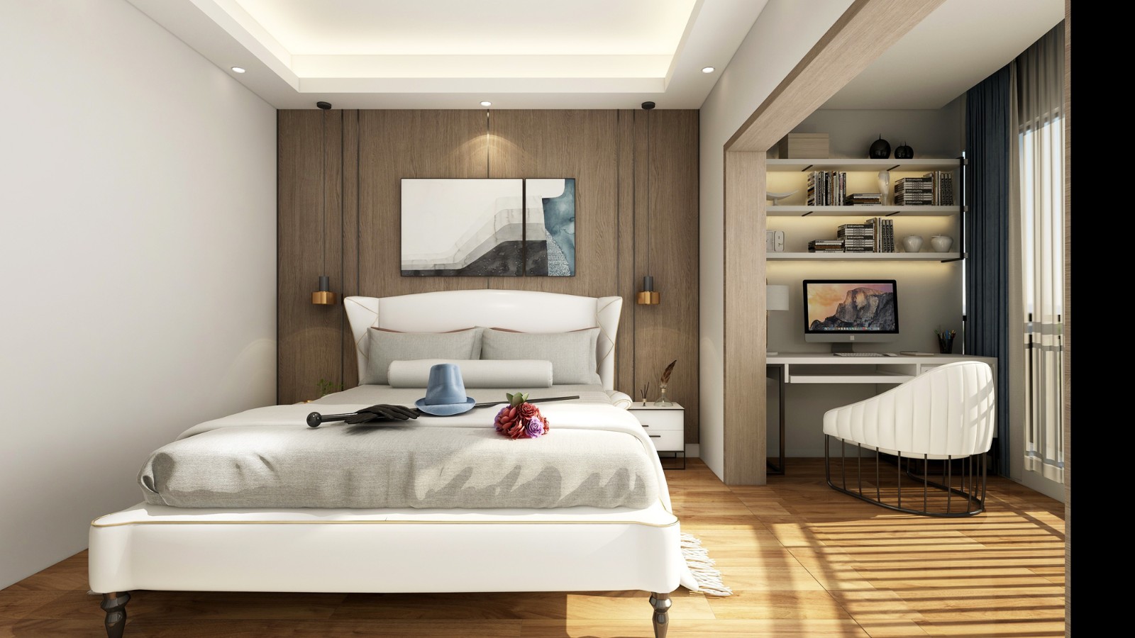主臥將陽臺打通,在增大的室內空間里打造出一個專屬的工作區(qū)。