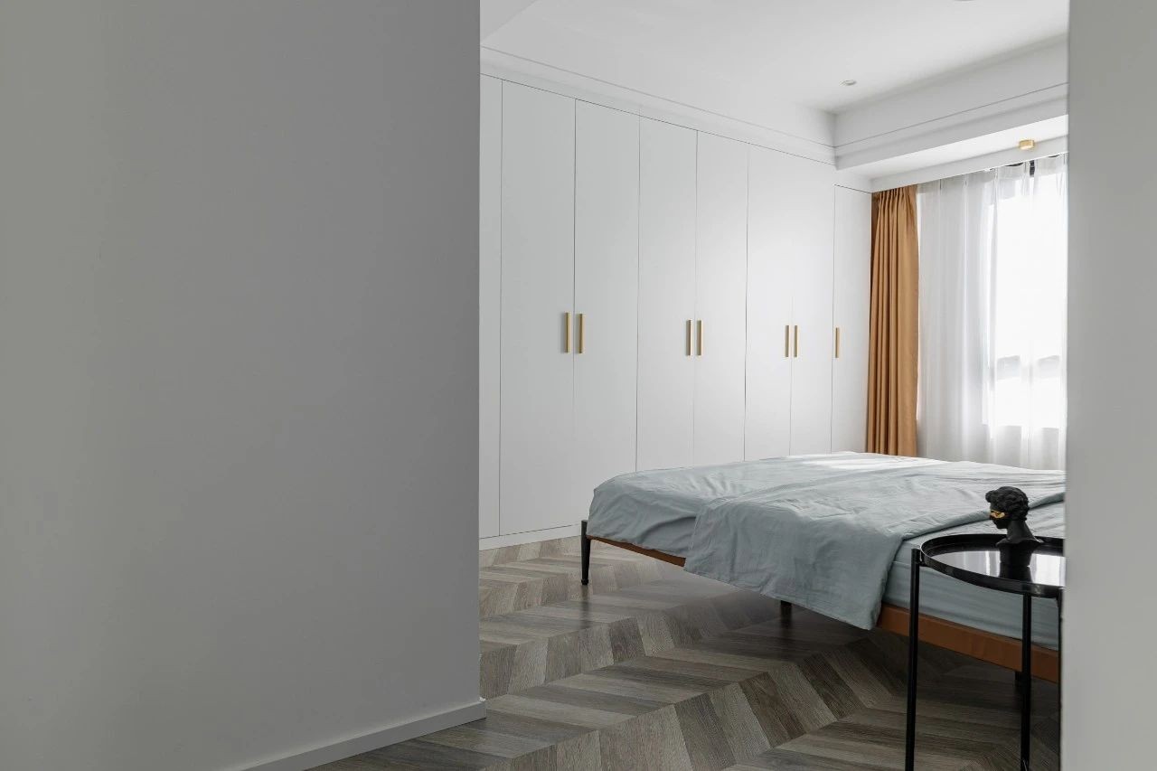 主臥的設(shè)計(jì)也延用了公共空間的配色,墨綠色作為床頭背景色,搭配黃色的皮革床,營造出低調(diào)高雅的氣質(zhì)。