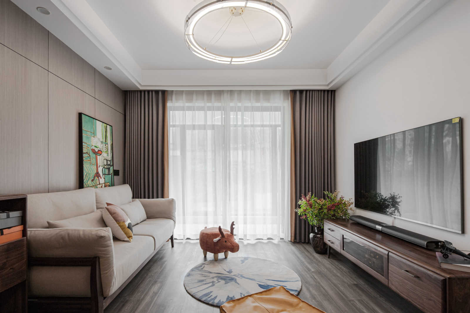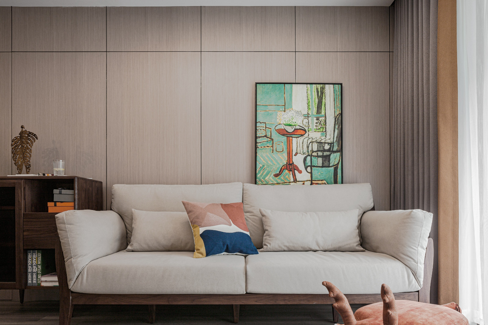 客廳戶型方正,整面木飾面板裝飾沙發(fā)背景墻,原木家具搭配米色布藝沙發(fā),文藝淡雅。