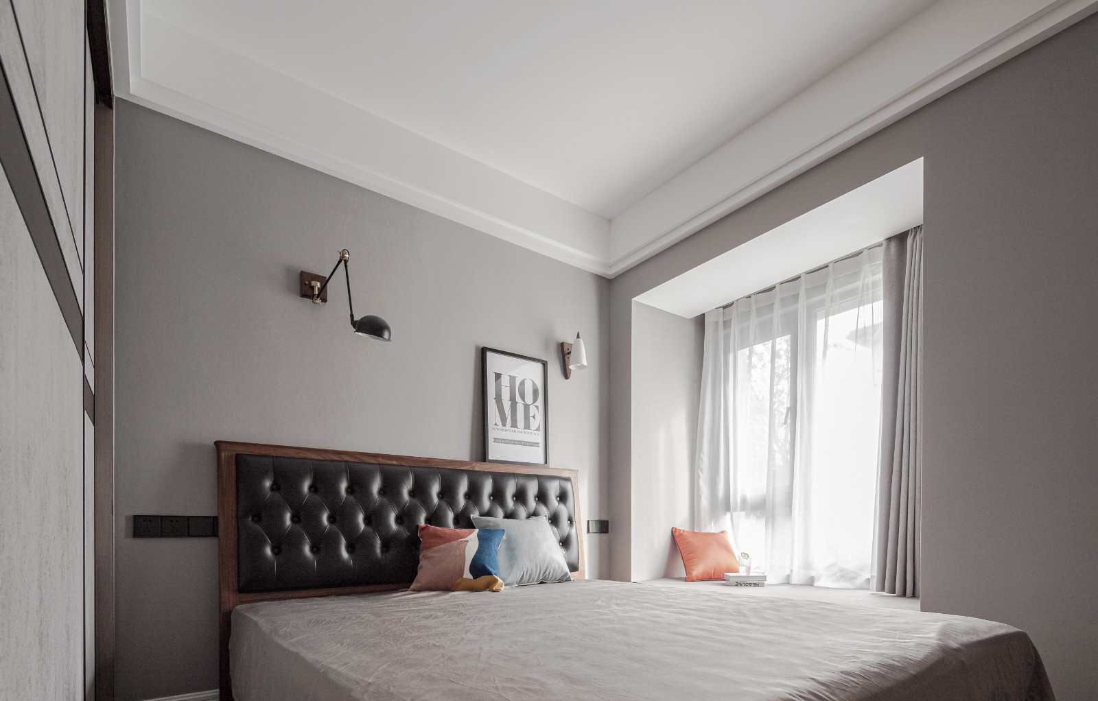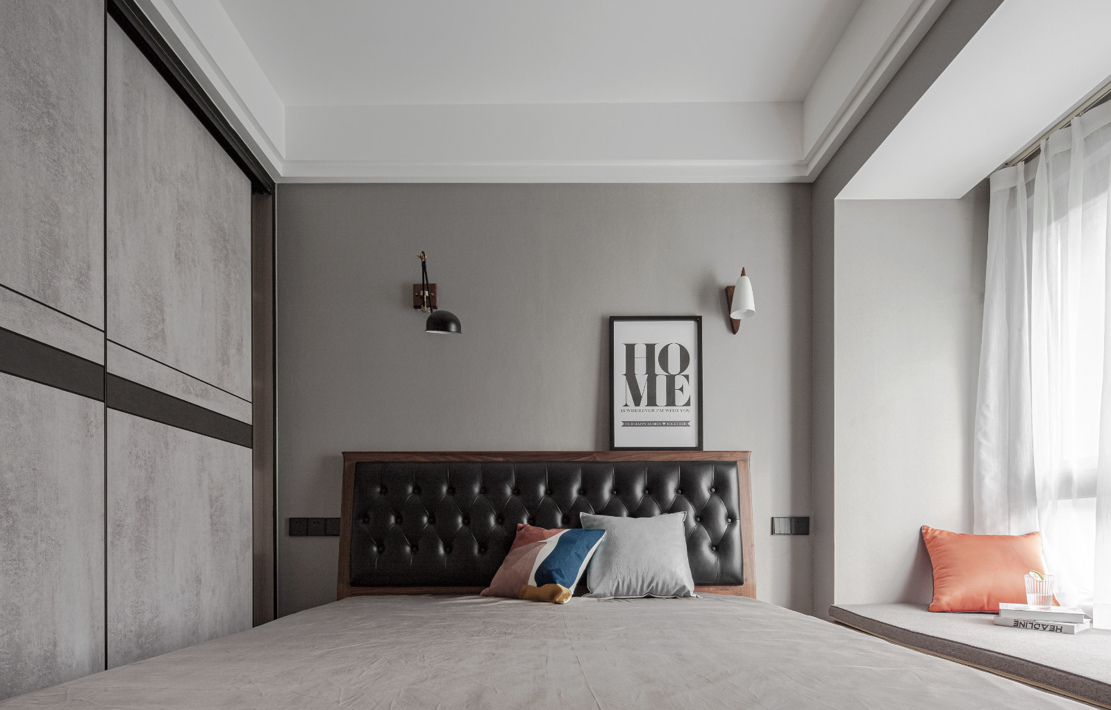主臥整體灰調(diào),淺色灰背景墻,搭配深灰色皮質(zhì)床靠背,棕色木紋家具經(jīng)典。