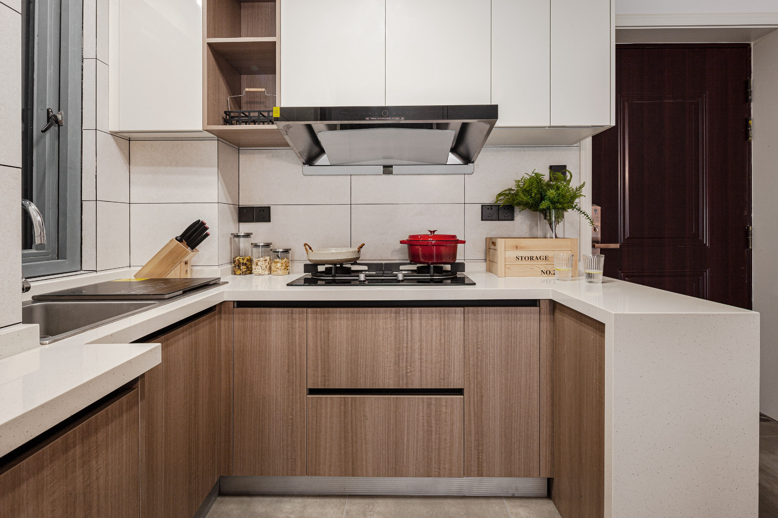 L型開放式廚房設(shè)計,充分利用轉(zhuǎn)角空間,合理布局。白色吊柜柜門+墻磚,搭配木紋櫥柜,色彩清爽簡約。