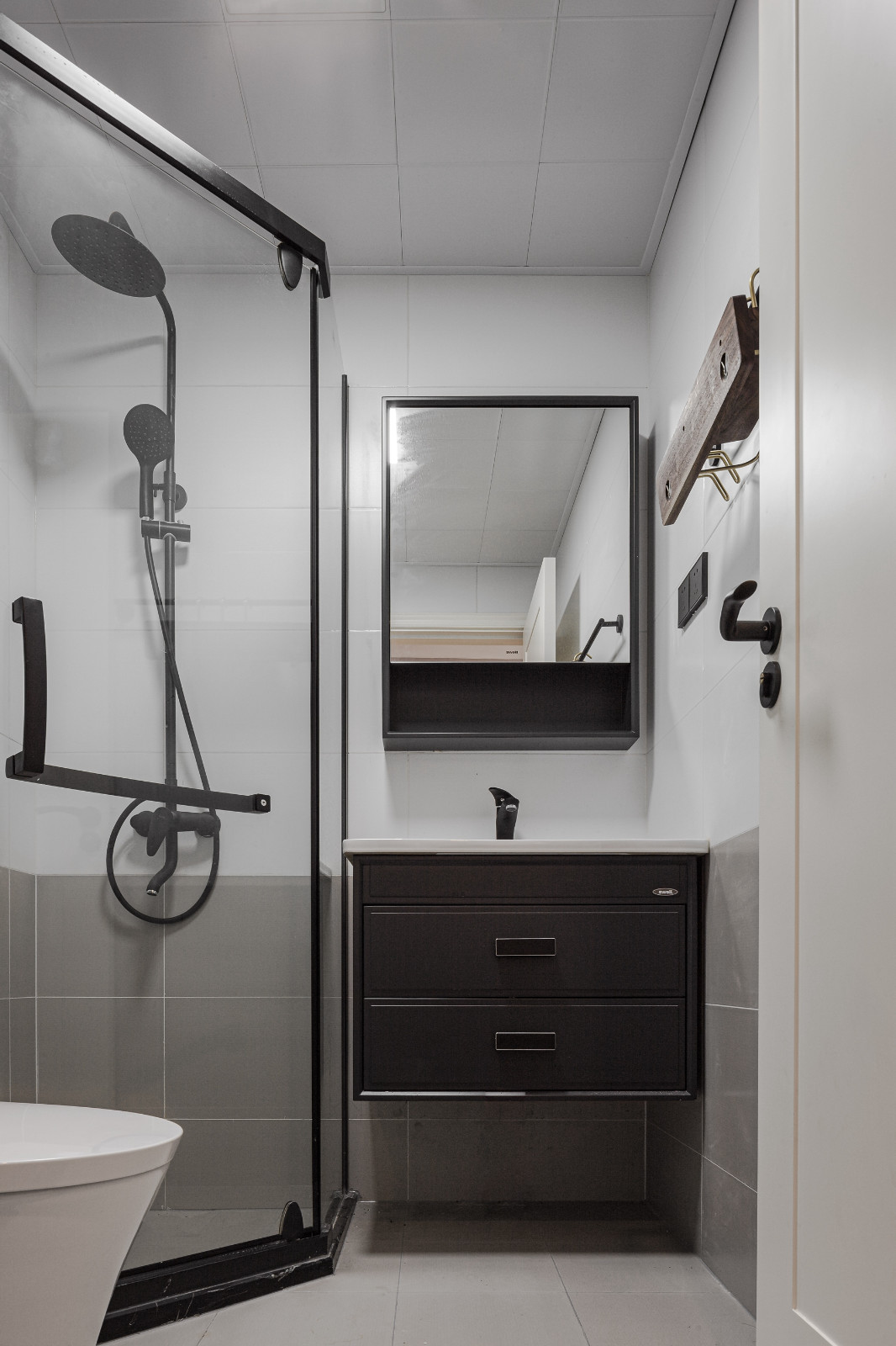 衛(wèi)生間簡約黑白灰掉,白色+灰色墻面腰線設(shè)計,深色簡約臺盆柜加深了空間層次感。