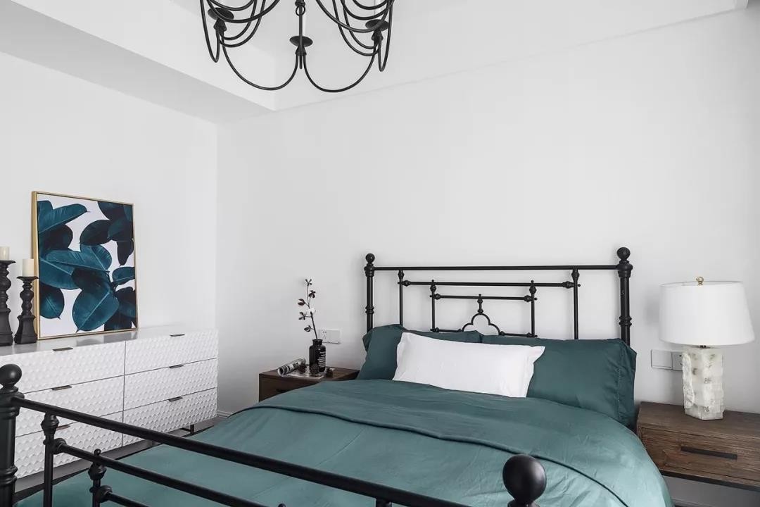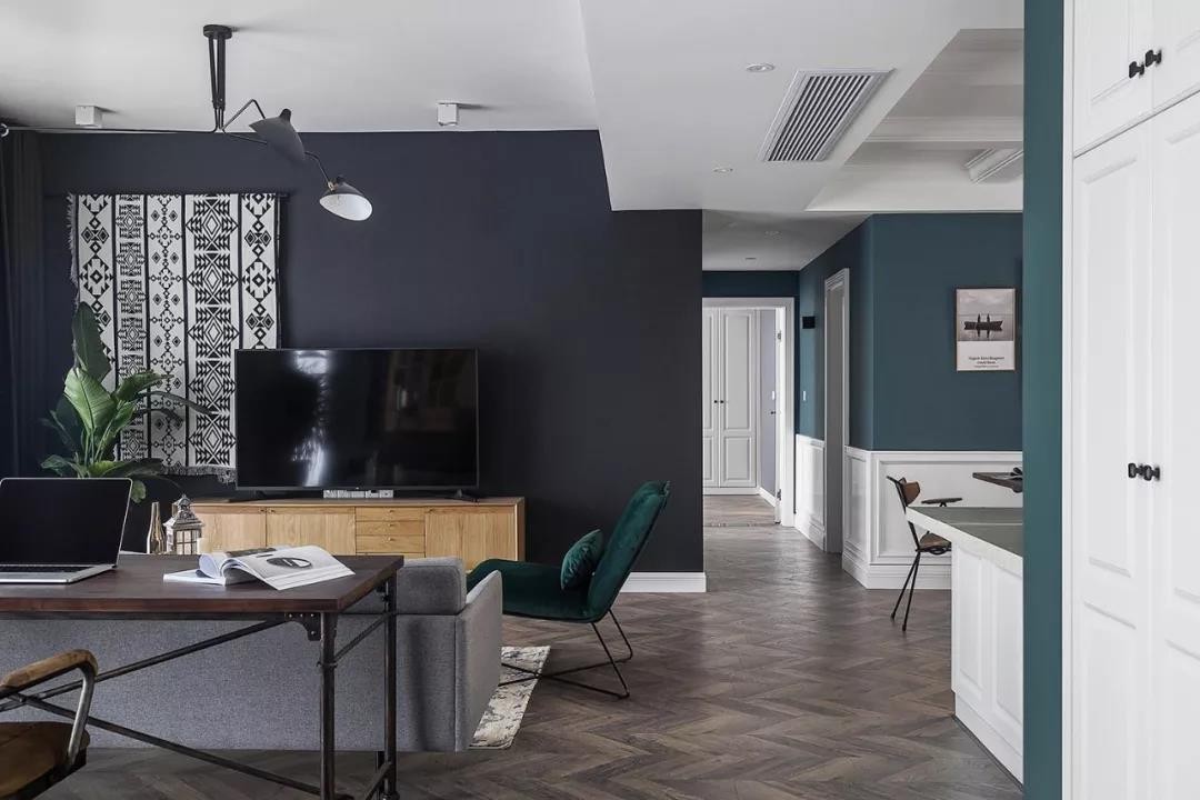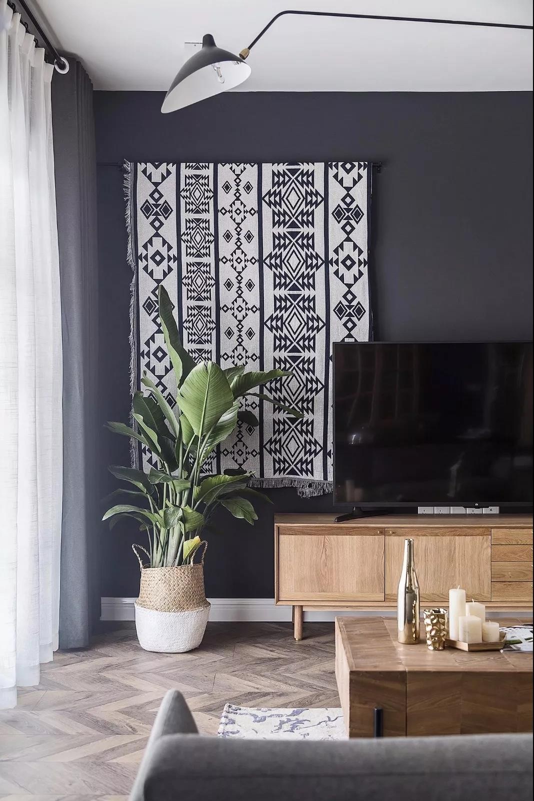 電視墻的設(shè)計(jì)也很有特色,在偏左的地方掛上一塊黑白相隔的毯子,在深灰色的電視墻上做了一個(gè)視覺(jué)沖擊的一個(gè)設(shè)計(jì),讓電視墻看起來(lái)不單調(diào),有個(gè)性。